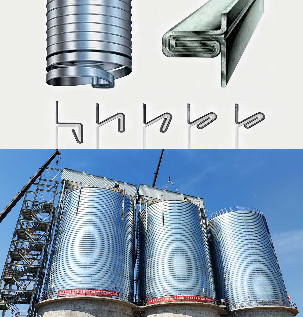 Common silo types: mainly bolted steel silos, spiral folded steel silos (Lipp silos), and welded steel silos.