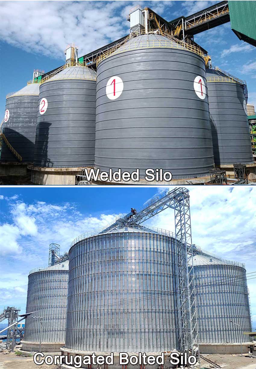 Common silo types: corrugated bolted steel silos, aluminum silos / stainless steel silos (304/316)